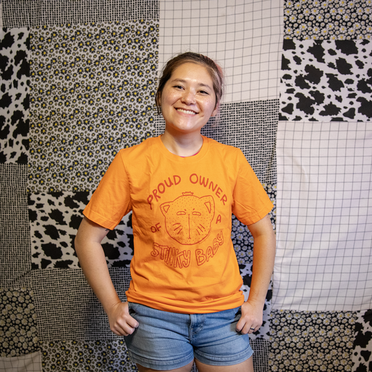 Proud Owner of a Stinky Baby | Screen Printed Unisex Tee | Orange Fruit Cat Illustration