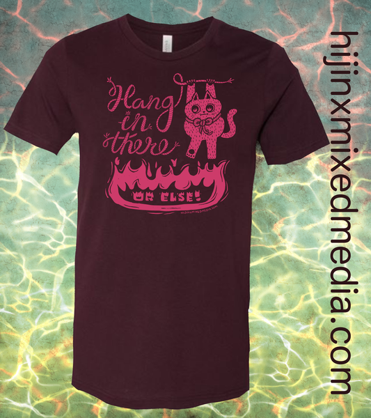 Hang In There (Or Else!) Cat Illustration Screen Printed Cotton Tee | Orange Ink on Black