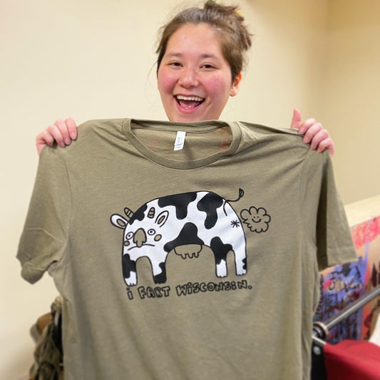 I Fart Wisconsin Farting Cow Illustration Screen Printed Tee | Assorted Colors | Heather Olive, Poppy Red, Strobe Yellow