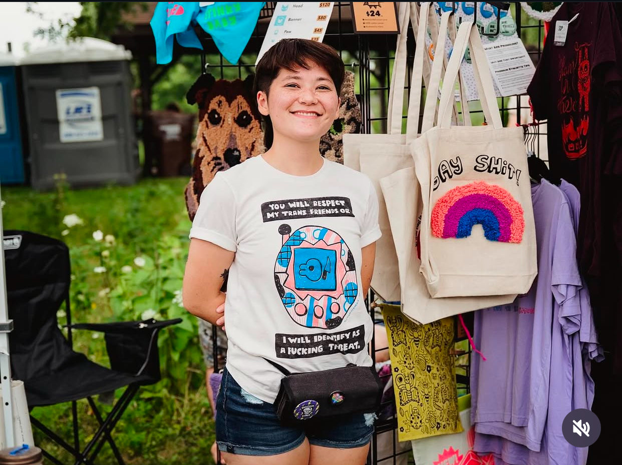 Original illustration of a trans-colored tamagotchi friend holding a knife. The creature says “You will respect my trans friends or I will identify as a fucking threat.”