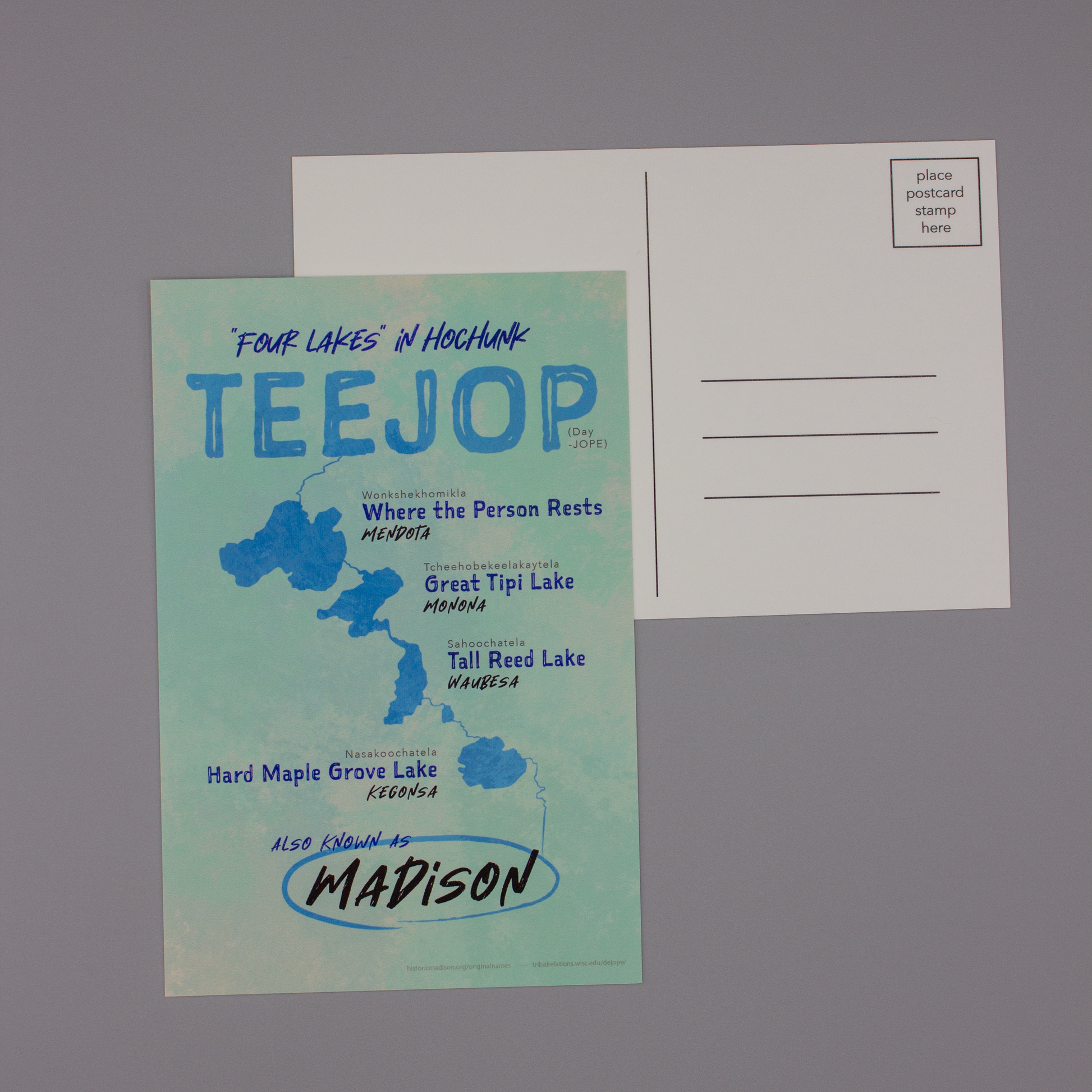 Before settlers called it Madison, it’s called Teejop (day-jope) by the Ho Chunk. Each of our four lakes in the area were named by settlers using various indigenous names including words from Dakota, Sauk-Fox, and Ojibwa. Of course, the Ho Chunk people did indeed already have names for the great bodies of water. In the Ho Chunk language Hoocąk, Teejop means four lakes.